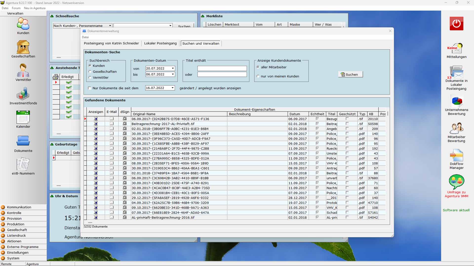 Und Agentura ist eines der wenigen Verwaltungsprogramme für Versicherungsmakler, die sowohl mit MSOffice als auch mit Libre/Open-Office zusammen arbeitet. Mit Einführung der DocFlow-Technologie werden Dokumente automatisch dem richtigen Kunden, Vertrag, Schaden oder Vermittler zugeordnet und wenn notwendig automatisch weitere Vorgänge angestoßen.